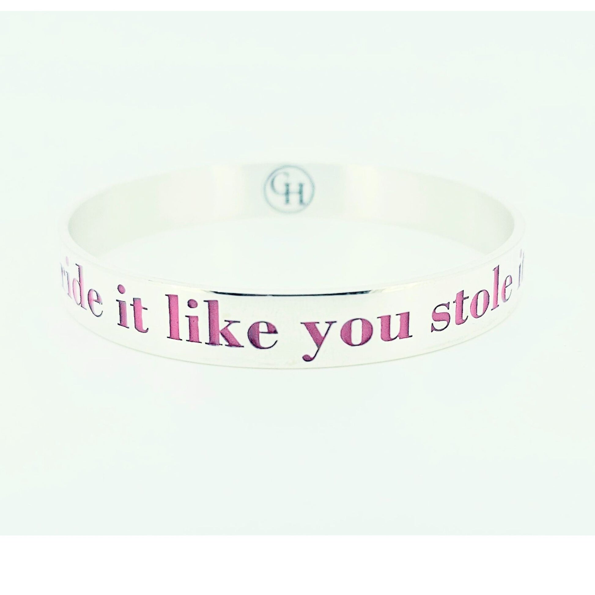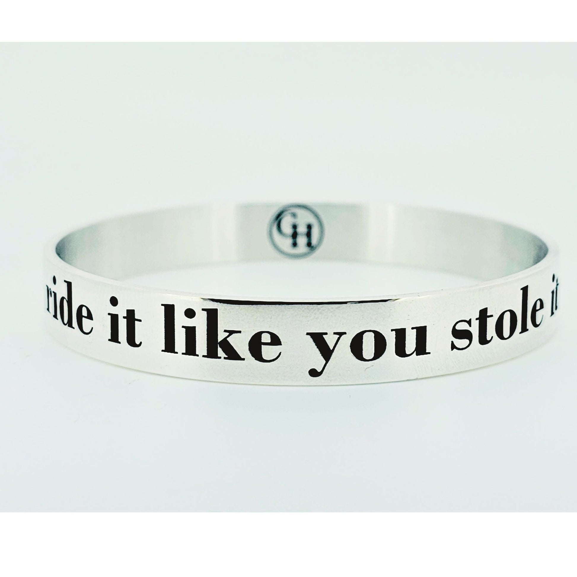 The Crawford Equestrian Jewellery “Ride It Like You Stole It” Bangle is a bold statement of equestrian grit, engraved with our most audacious mantra for riders who live with courage, focus, and resolve. This isn’t just jewellery — it’s your mindset, made wearable.